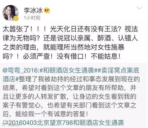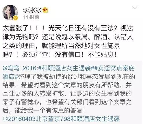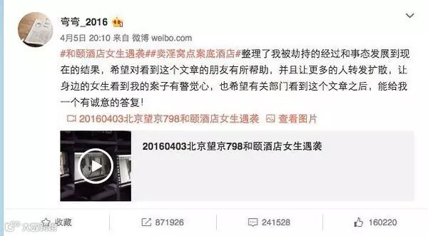 4月5日晚,网友弯弯_2016连发数条微博称入住北京酒仙桥798附近的和颐酒店遇不明身份男子袭击,她被掐脖子强行拖拽,现场酒店的保洁和围观群众误以为是男女朋友吵架而没有及时阻拦,幸好最后遇到了一位好心的女士阻拦,方才惊险逃脱。这件事在微博迅速发酵,其中一条微博在4月6号中午十二点就有了惊人的八十多万条转发。
