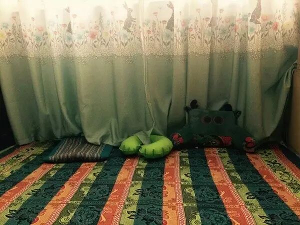 阳台是拐角窗,但是墙壁很破,阳台左边还藏着个老柜子,右边还藏着个老式缝纫机,中间是个很大的木凳子。