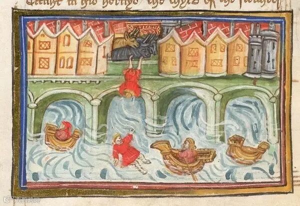 把厕所修在足够高的桥梁上倒是可以避免这种危险,比如早期的伦敦桥,并不像现在两座高塔对峙,而是一座上面建满房屋的拥挤河上小镇。伦敦桥上居民也要解决个人问题,这里的公共厕所直接高空抛物落入泰晤士河,从桥下经过的船员要是敢四十五度角忧郁仰望伦敦的天空,十有八九会吃一嘴,所以有谚语说:“聪明人桥上过,笨蛋桥底过”。不得不从桥底过的人唯一解气的时刻,就是上面的轰炸者不慎从茅坑掉进河里——从图四这张警告看来,这种惨案估计还时有发生!