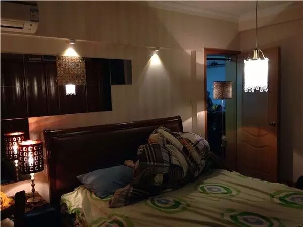房间大致弄好了,床单床具全换新了,所有灯光打开是这样