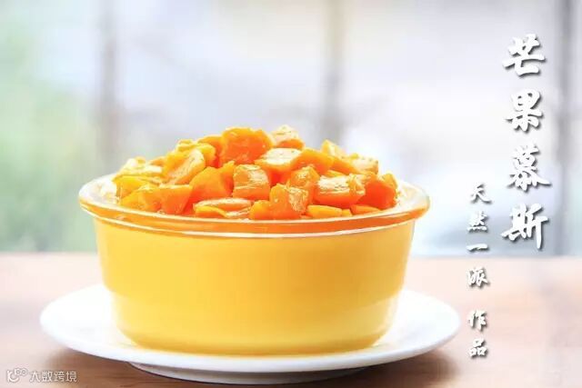 堆在慕斯表面的芒果粒,最好在准备吃的时候再切。