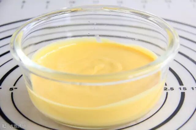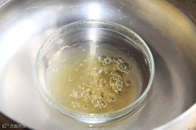 将装有吉利丁的容器放入70℃左右的热水中(水不要没过容器),使吉利丁融化成液态。