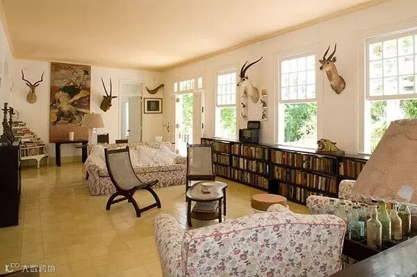然后,客厅,也是整座维吉亚庄园最重要的家居装饰元素就要出场了——兽头,你可以在阅读中数一下,海明威一共用了多少个动物头来装饰自己的家,同时炫耀自己的男性雄风。在客厅东墙上的斗牛油画左右两旁,各有一个羚羊头,左边是他1934年去非洲游猎的战利品,右边是他同年在肯尼亚打的。