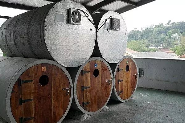 来这边的时候,我问叶酱推荐了一家旅馆。进门的时候发现装修挺好挺干净,走上楼的时候觉得房间看起来也不错,似乎物超所值,但一直没有找到我住的房型。后来看了指示牌才知道,我住的所谓胶囊房是在天台堆着的几个水桶里。