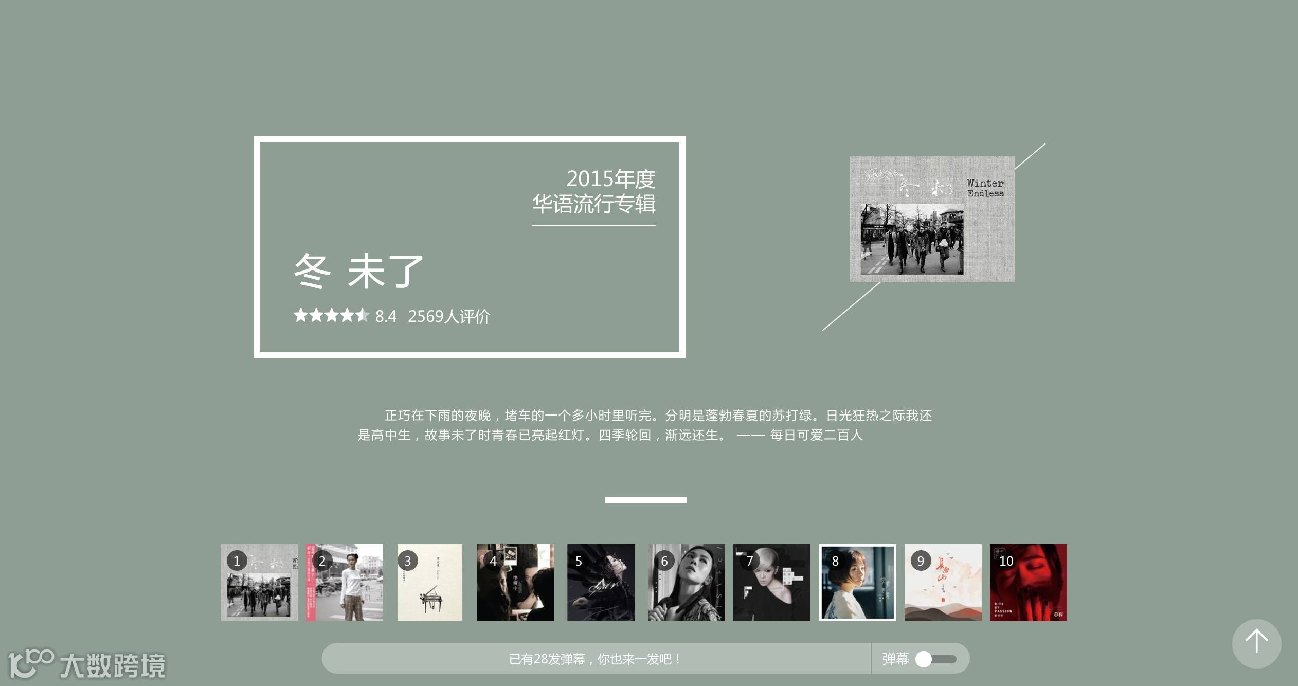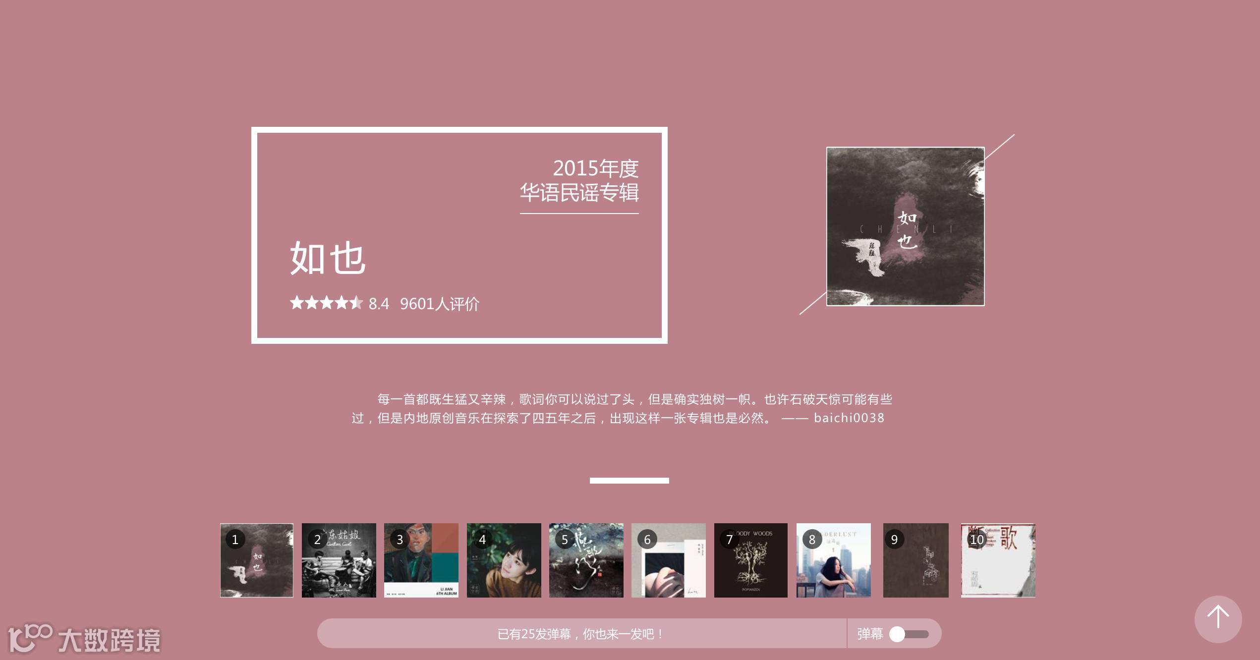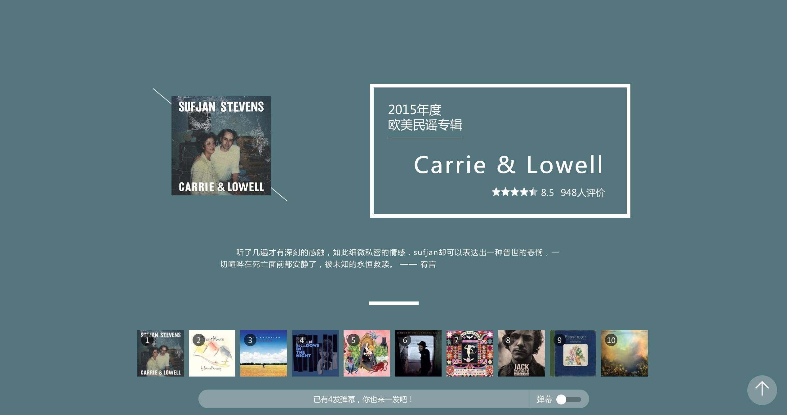 回首2015,很多音乐带给我们温暖与激情 豆瓣音乐与你一同见证,帮你发现更多好音乐、提供更有价值的评分和评论参考 新的一年我们一同 “让好音乐继续”。