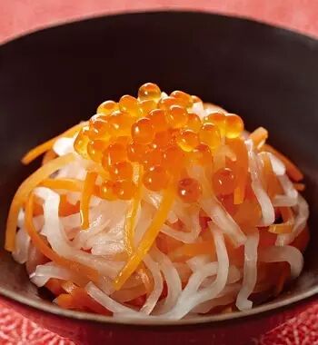 祝い肴三種(三つ肴、口取り)、三种前菜。包含黒豆、数の子、ごまめ(田作り),关西地区以黒豆、数の子、たたきごぼう为主。