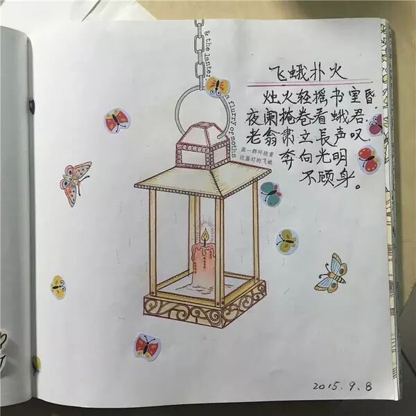 老奶奶非常有童趣,在涂色本上贴小贴画,有时也会根据涂色作品的意境,配上她认为合适的诗词。每一篇下面都记了日期。比如,她在教师节那天就专门涂了一张表达了对老师的敬意,而她女儿正好就是老师。