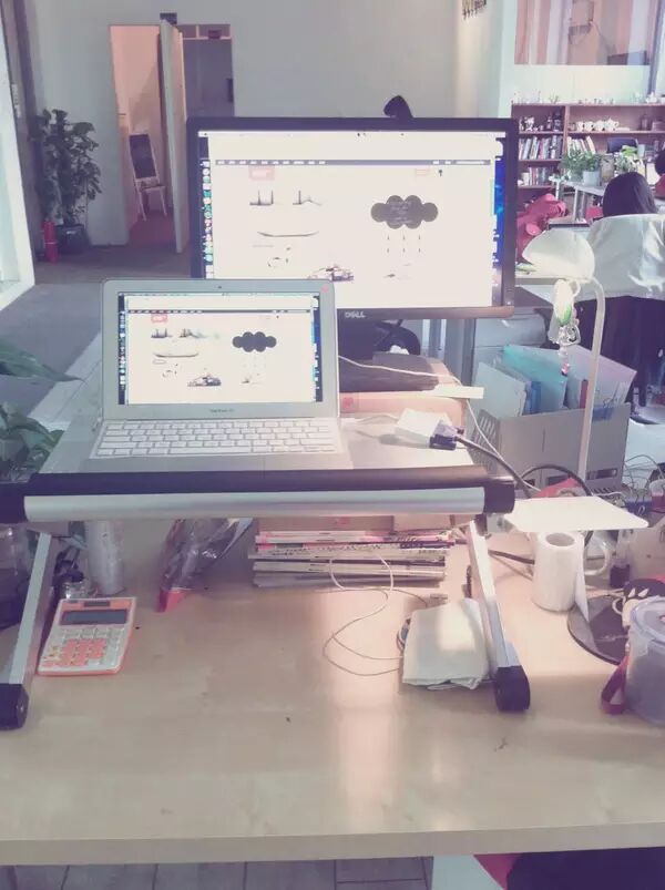 那个腰疼起来真是要命,根本坐不住,所以买了站立电脑桌,使用了一段时间,刚开始调试了很久,只是把电脑放在架子啊上,眼睛位置合适了,胳膊位置又高了,胳膊常年位置不对也会有问题,所以现在采用的是把外接屏幕加高到眼睛合适的位置,架子调到键盘合适的位置,刚开始站着不宜太久,退容易累,所以在架子下面我留了一块位置用来坐着时候放电脑,一般站1个小时,坐1小时,穿插进行,保护腰腿。