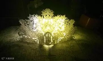 当然,左右折叠的层数是可以改变的,层数不同之后的打光效果也会不同,可以多做一些尝试。这里还有一点需要注意的是要把中线下面的部位剪掉一块(也就是小房子的底部),来保证开合的顺利,不被卡住。