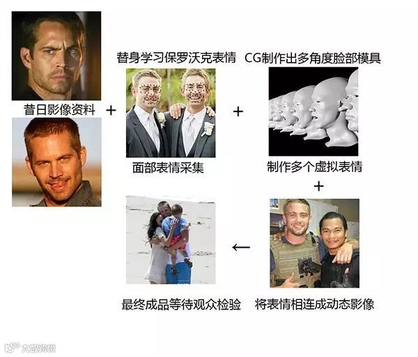 特写及近景替身大多是由保罗的两个弟弟完成,Caleb(迦勒)和Cody(柯迪)。一个身形上比较接近,因此为动作替身,一个样貌上比较相似,因此为表情替身,剩下的就是交给业内动作捕捉技术领头羊维塔特效公司了。剧组通过CGI技术将保罗的面部表情移植到替身的身体上,大概在影片15分钟左右,出现了第一幕使用CGI重塑保罗·沃克的影像。