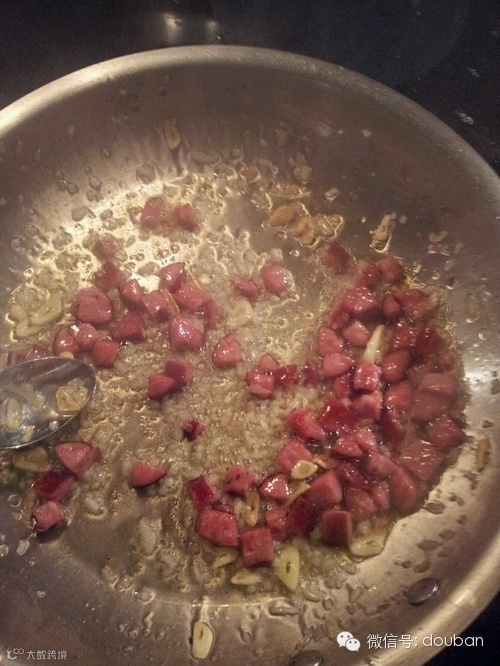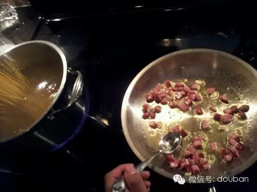 平底锅烧热,少许橄榄油,下pancetta, 待猪油溶出,越五分油温,下洋葱丁,之后蒜片,煸炒至香,倒入白葡萄酒喷香,如下图。