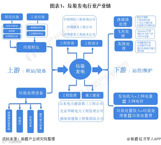 根据垃圾处理流程,垃圾发电产业链包括上游垃圾转运、垃圾处理设备制造,中游垃圾发电厂设计、建造以及下游垃圾发电厂运营、维护。