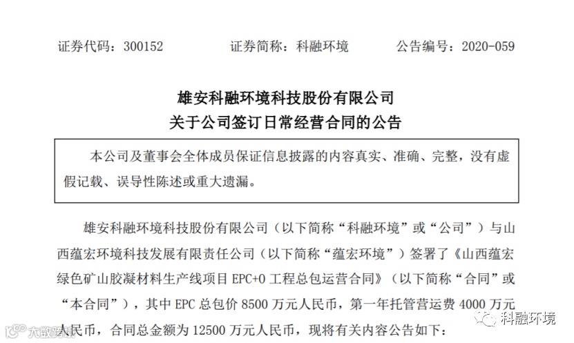 9月23日晚间,科融环境发布公告,公司与山西蕴宏环境科技发展有限责任公司(简称“蕴宏环境”)签署了《山西蕴宏绿色矿山胶凝材料生产线项目EPC+O 工程总包运营合同》,合同总金额为1.25亿元,其中EPC总包价8500万元,第一年托管营运费4000万元。