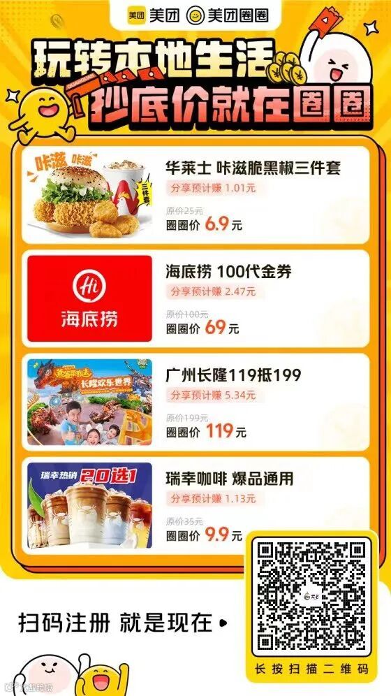 美团圈圈是美团旗下的一个本地生活团购分销平台,覆盖全国1000+城市,为全国的用户筛选优质且折扣力度大的同城吃喝玩乐团购产品,全网低价1折起,吃喝玩乐一应俱全,随时退,免费退!