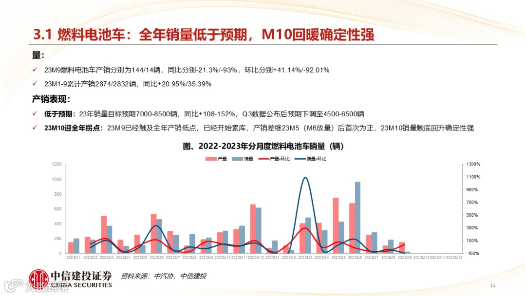 量:23M9燃料电池车产销分别为144/14辆,同比分别-21.3%/-93%,环比分别+41.14%/-92.01%;23M1-9累计产销2874/2832辆,同比+20.95%/35.39%