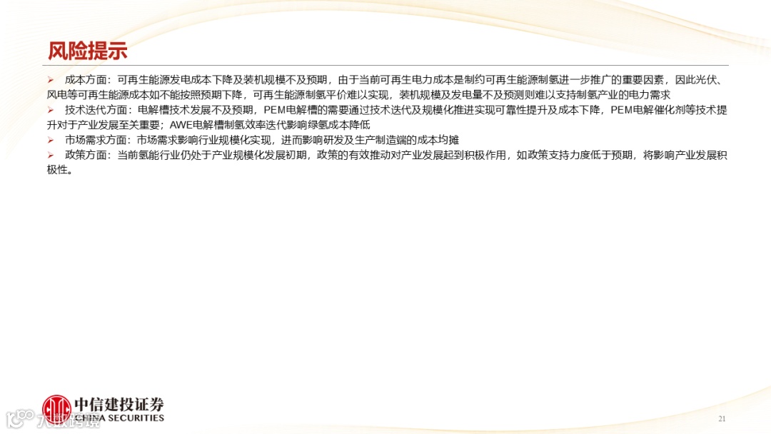 成本方面:可再生能源发电成本下降及装机规模不及预期,由于当前可再生电力成本是制约可再生能源制氢进一步推广的重要因素,因此光伏、风电等可再生能源成本如不能按照预期下降,可再生能源制氢平价难以实现,装机规模及发电量不及预测则难以支持制氢产业的电力需求