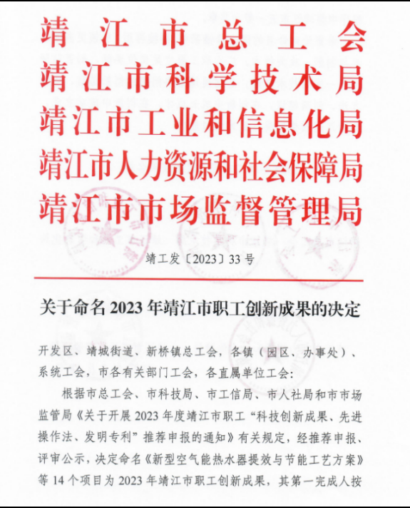 近日,靖江市总工会、市科技局、市工信局、市人社局和市市场监管局公布《关于命名2023年靖江市职工创新成果的决定》(靖工发〔2023〕33号),深国际港口江苏靖江港“职工创新工作室”张亮亮申报的《一种生产可视化仿真操作法》成功被命名为“2023年靖江市职工创新成果”。