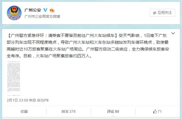 在2月1日,广州火车站广场西侧,春运启动第8天,广州各大火车站迎来节前客流高峰,广州火车站当日发送旅客17.4万人,广州东站发送旅客14.6万人。受北方雨雪影响,广州市公安局新闻办公室1日晚上通报,2月1日南下广东部分列车出现不同程度晚点,导致广州火车站和火车东站多趟始发列车循环晚点,致使有近10万旅客聚集在火车站广场周边,人员密度非常高,有个别乘客冒着风雨在广场一站就是十几个小时。