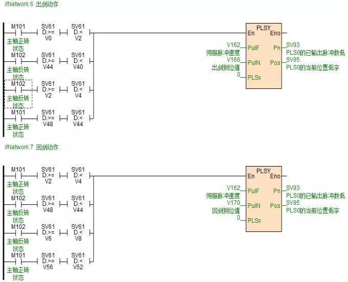 为了解决此次项目的难点,本次程序采用模拟机械连杆结构的方法来实现相应功能,使用A/B相1倍频的单段比较模式来检测主轴的频率及位置,检测到主轴位置后使用PLSY指令使从轴快速跟随到相应的指定位置。整体的控制要求PLC和伺服电机都有较快的响应速度,使用海为PLC和伟创的伺服电机机台正常运转,效果良好。
