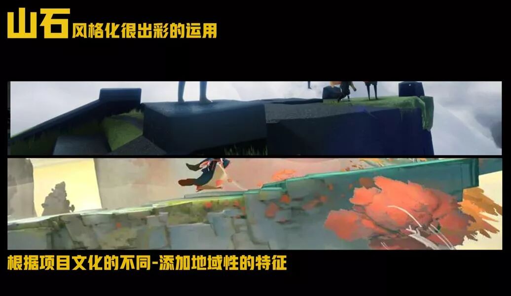 这两个图都是山石风格化的出彩应用。当然在实际的场景绘画中,做大量的风格设计来交出完美答卷与项目时间上所形成的冲突也是需要我们自己去衡量的。