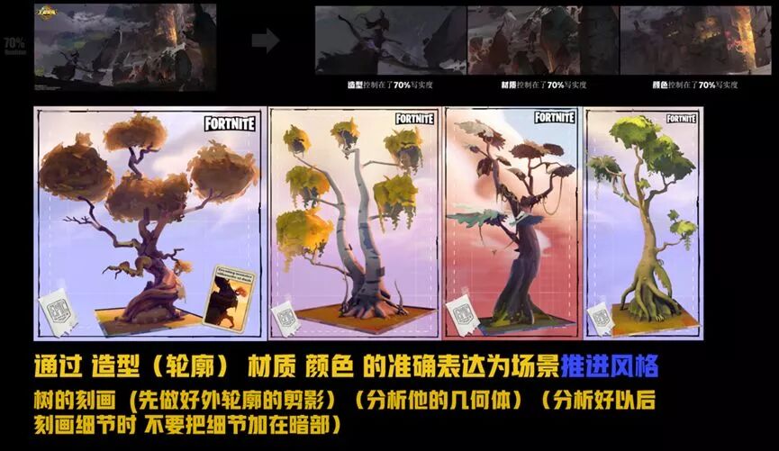 再来分析《堡垒之夜》中四种不同种类的树,可以看到虽然树的品种不同,但是在进行了匹配风格的写实度系数和题材把控后,整体风格是一致的。