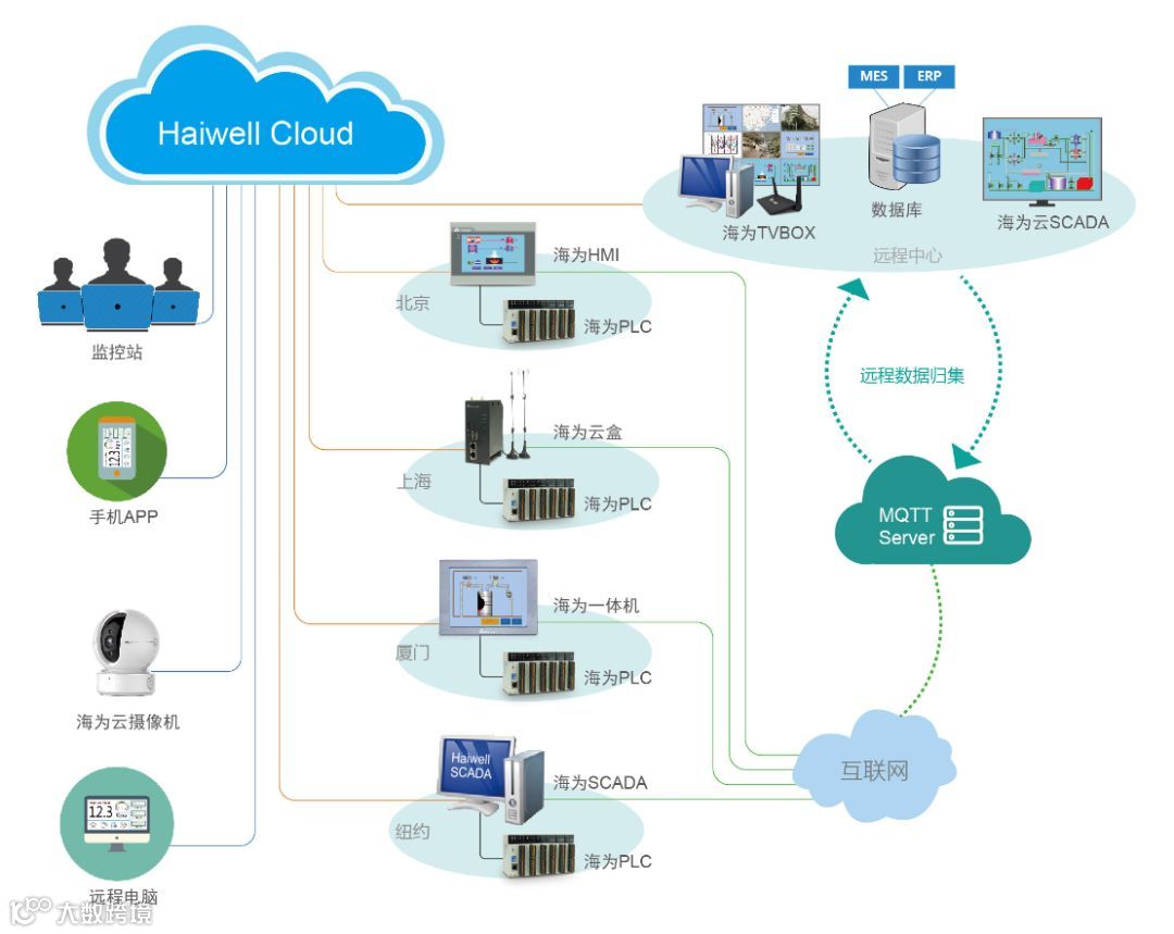 智慧工厂注重对异地数据整合,进而实现统一监控管理。海为所有云设备都支持MQTT协议,通过互联网,传输到MQTT服务器上,远程中心数据库对发来的数据进行存储,供ERP、MES系统调用。