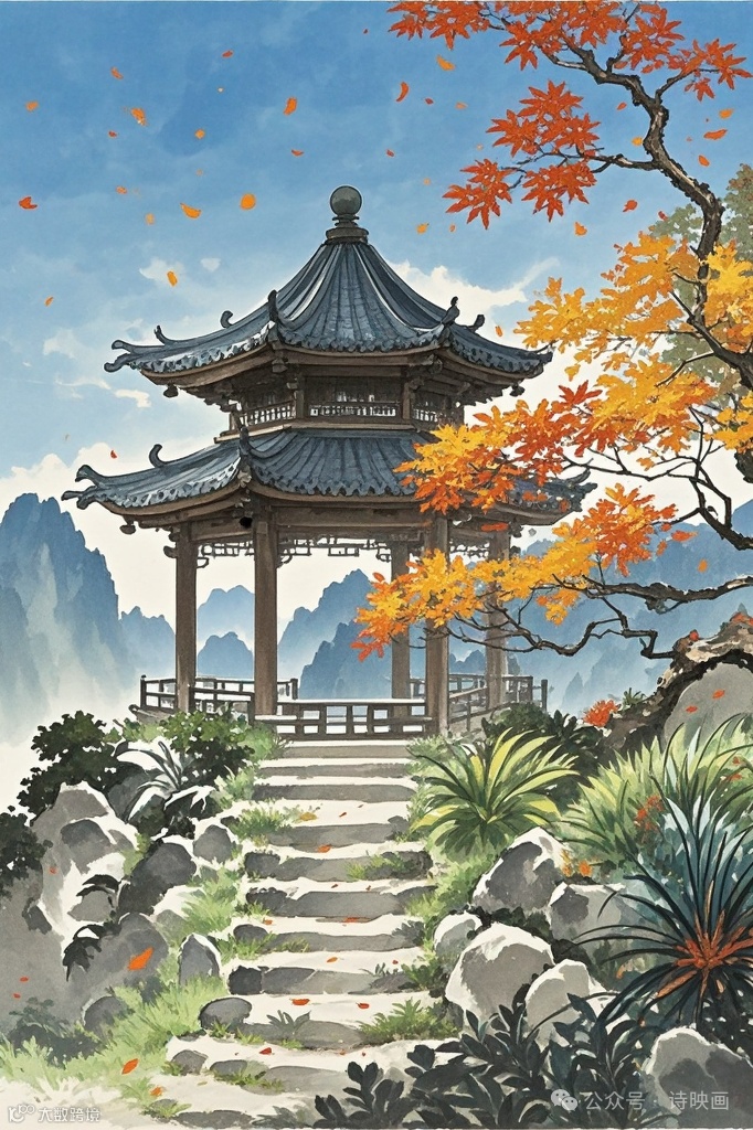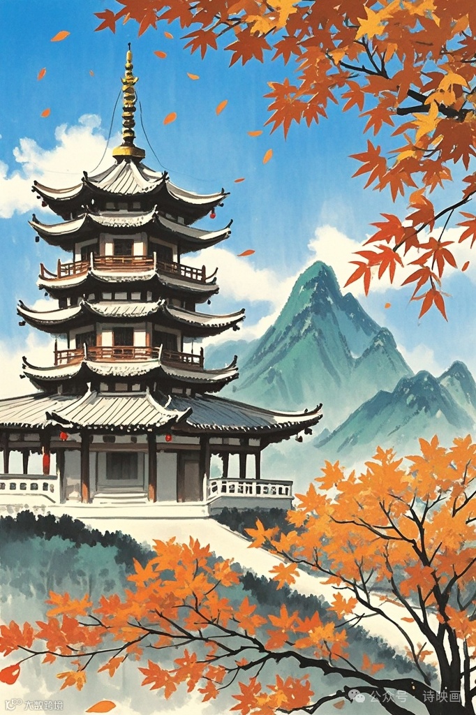 首句 “楼倚霜树外”,诗人站在高楼上眺望,楼阁高耸,超出了经霜后带有秋色的树林。一个 “倚” 字,写出了楼阁的高耸姿态,仿佛依靠着树林向更高处伸展,同时也点明了诗人所处的位置较高,为后文描写开阔的秋景奠定了基础。