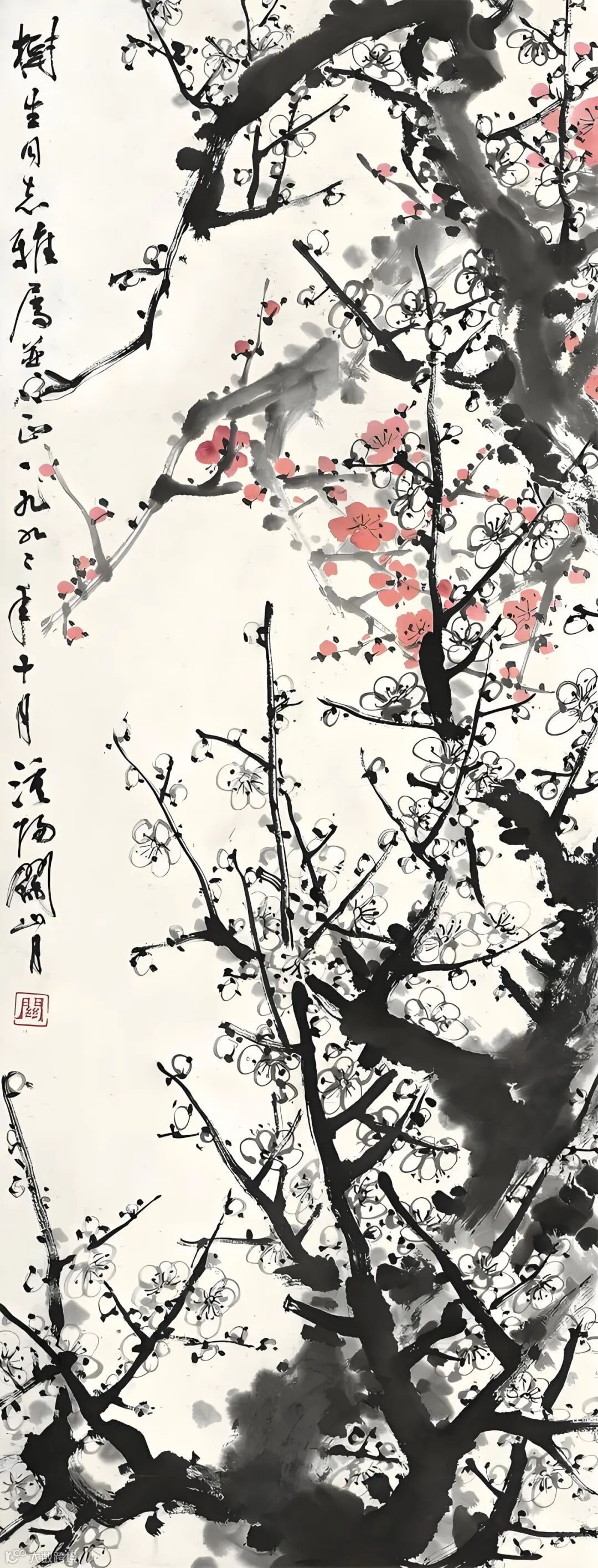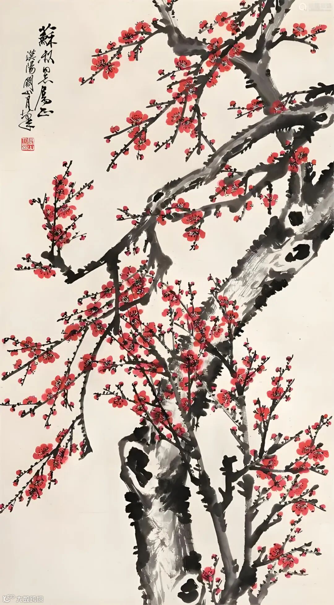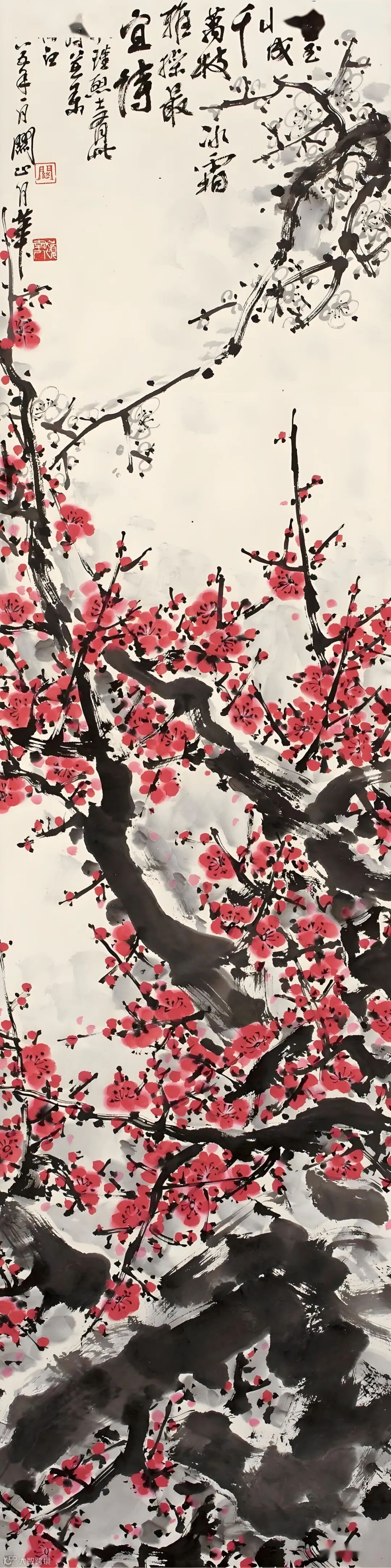他的作品题材广泛,于山水、花鸟、人物皆有佳作,尤其擅长画梅。他所画的梅花别有韵味,枝繁花茂,错落有致,色调饱满,繁花灼灼似火焰,枝干粗壮如铮铮铁骨,体现出梅花的蓬勃生机与傲寒品格,形成了独特的 “关梅” 风格。