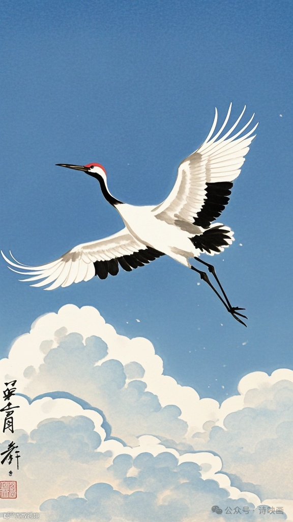诗歌的后两句 “晴空一鹤排云上,便引诗情到碧霄”,通过描绘一只仙鹤在晴朗的天空中冲破云层、直上云霄的壮丽景象,表达了诗人的豪情壮志和豁达心境。仙鹤这一形象,在中国文化中具有高雅、圣洁、不屈的象征意义,诗人以鹤自喻,或者将鹤视为不屈的化身,借鹤的凌云之势,抒发自己在困境中依然保持积极向上、奋发进取的精神。这种以景寓情的手法,使诗歌的意境更加深远,情感表达更加含蓄而有力。