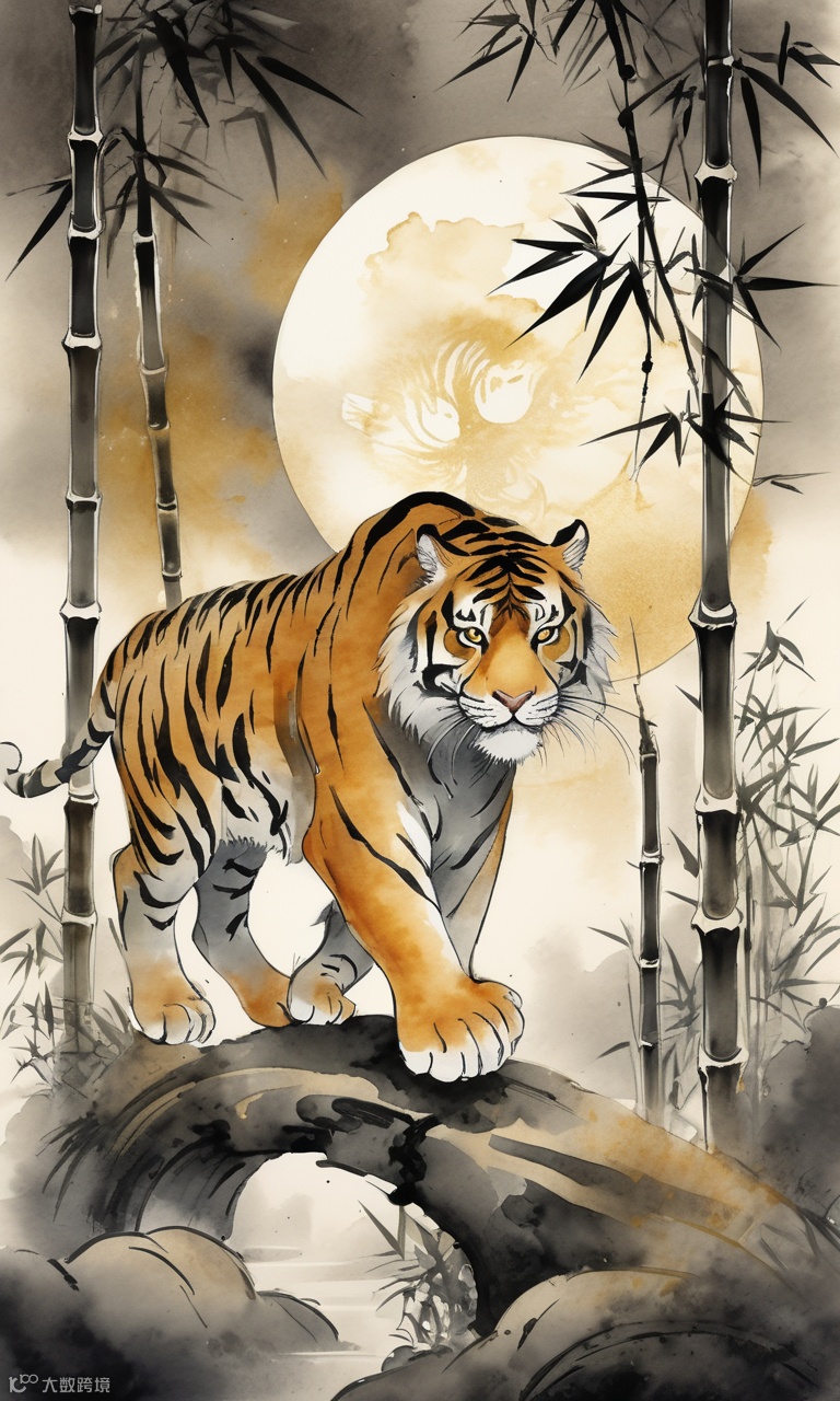 老虎以其强壮的体魄和威猛的气势象征着无与伦比的力量和无畏的勇气。在古代,老虎常被用来形容勇猛的战士和英雄。