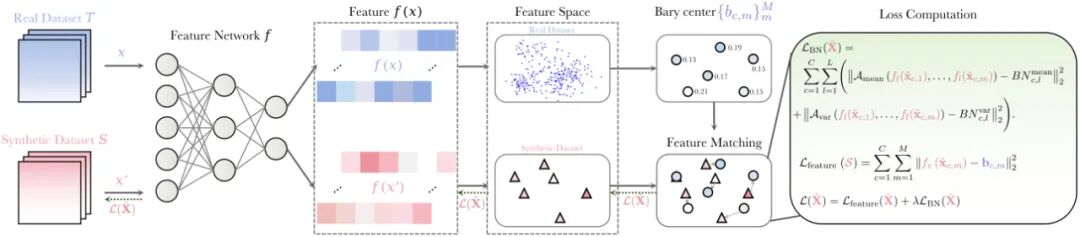 WMDD 的实现策略兼顾了理论优雅与工程可行性。我们将合成过程置于预训练分类器的特征空间:对每个类别,先提取所有真实样本在倒数第二层的特征表示,然后在这个空间中计算 Wasserstein 重心。这个重心不是单点,而是由少量带权"锚点"组成的离散分布,每个锚点及其权重共同刻画了类内的多样性。接下来,我们通过梯度下降优化原始图像空间中的合成样本,使其在特征空间中的表示逼近这些锚点。
