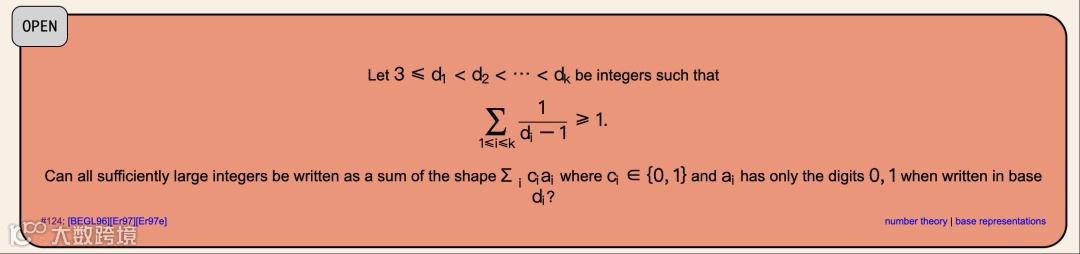 Erdos 问题 #124 内容如下图所示,由于该证明存在微妙的错误,目前仍是一个开放问题。