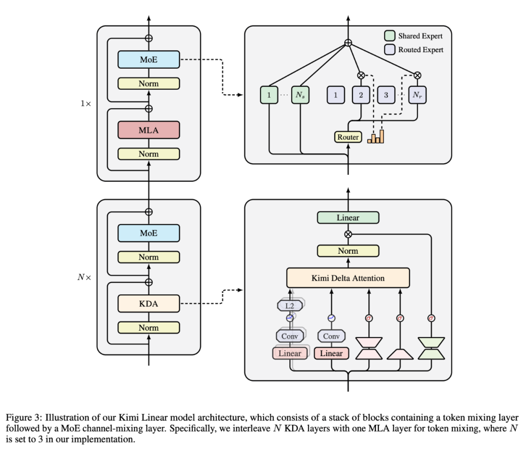 该模型架构的主干遵循 Moonlight 的设计。除了细粒度门控之外,该模型还利用了几个组件来进一步提高 Kimi Linear 的表达能力。Kimi Linear 的整体架构如图 3 所示。