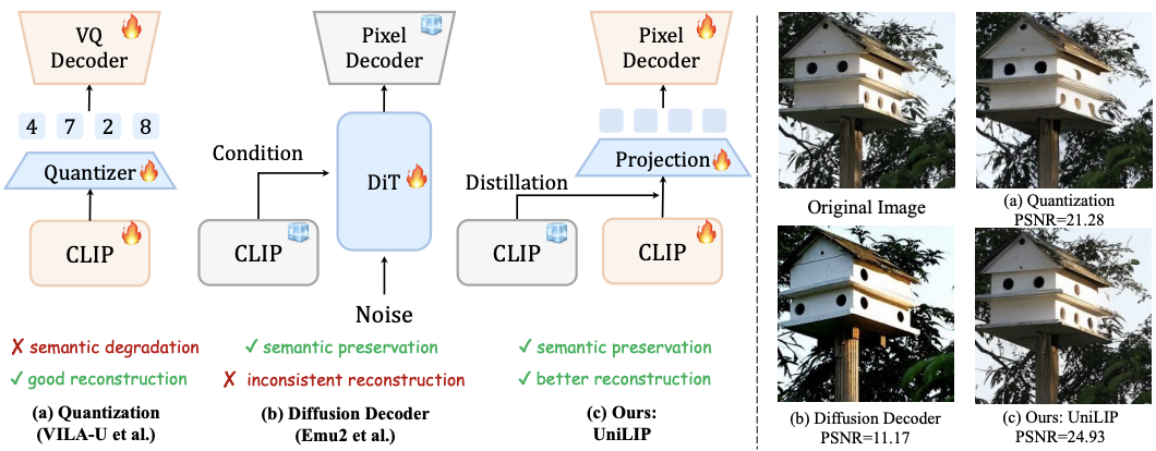 为冻结的CLIP训练解码器,则因特征细节丢失导致重建质量低下,难以支持编辑 。例如,近期的RAE模型使用冻结的DINOv2进行重建,其重建PSNR仅达到了19.23 。