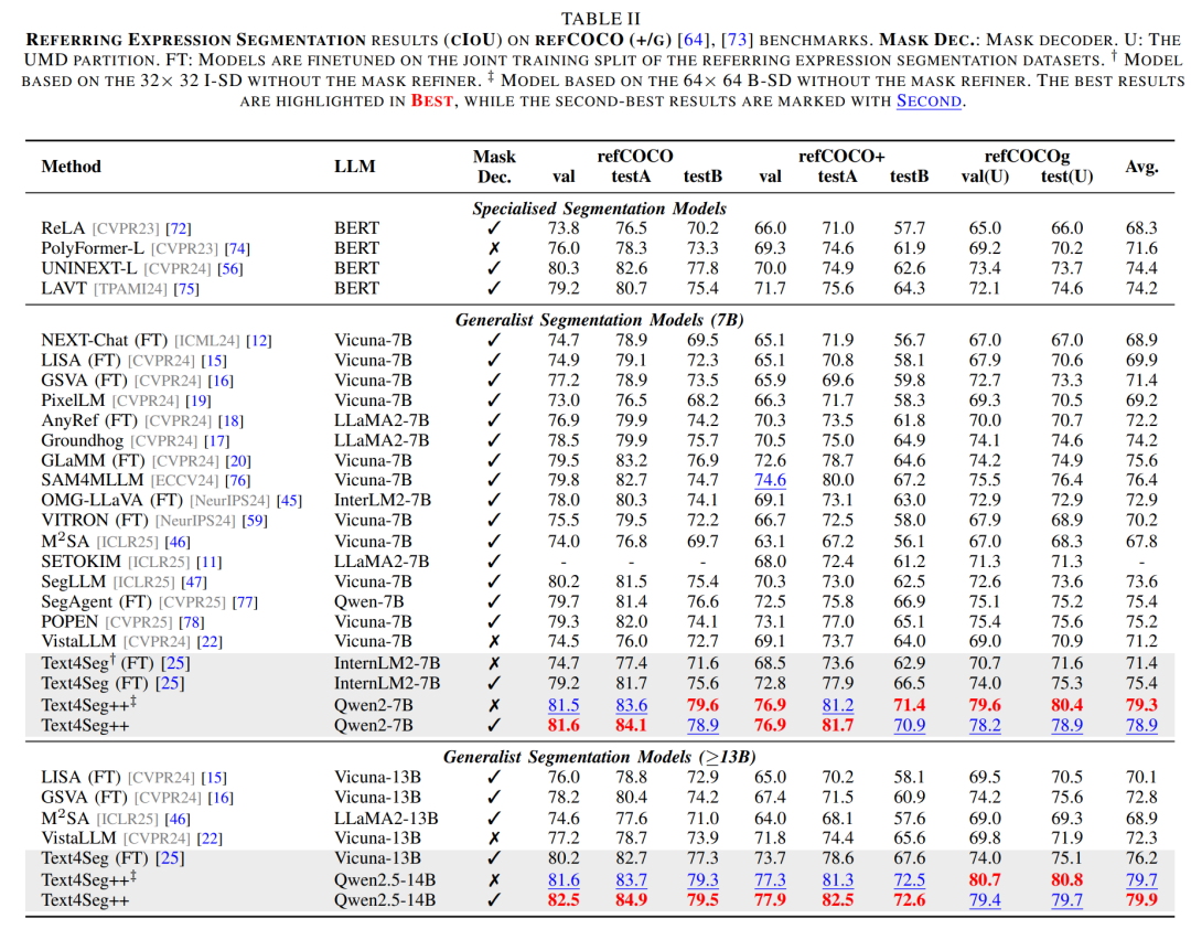 来自南洋理工大学、武汉大学和字节跳动的研究者们提出了一种全新的范式 Text4Seg++ ,将图像分割巧妙地转化为一个纯粹的文本生成问题。其核心思想是“文本作为掩码”(text-as-mask),通过生成一种名为“语义描述符”的特殊文本来表示分割结果,从而完全抛弃了传统的分割解码器。该方法不仅极大地简化了模型架构,还在多个分割基准上取得了SOTA性能,展示了其强大的有效性和泛化能力。