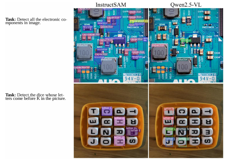 在开放式目标检测的设定下,InstructSAM 展现出和近乎常数(和预测的边界框数量无关)的推理时长,而其他方法的推理时间会随目标数量线性增长。与将边界框表示为自然语言词元(token)的方法不同,InstructSAM-Qwen 相比 Qwen2.5-VL 减少了 89% 的输出词元数和 32% 的总推理时间。随着模型规模的扩大,这一优势更加显著,凸显了 InstructSAM 框架的高效性。