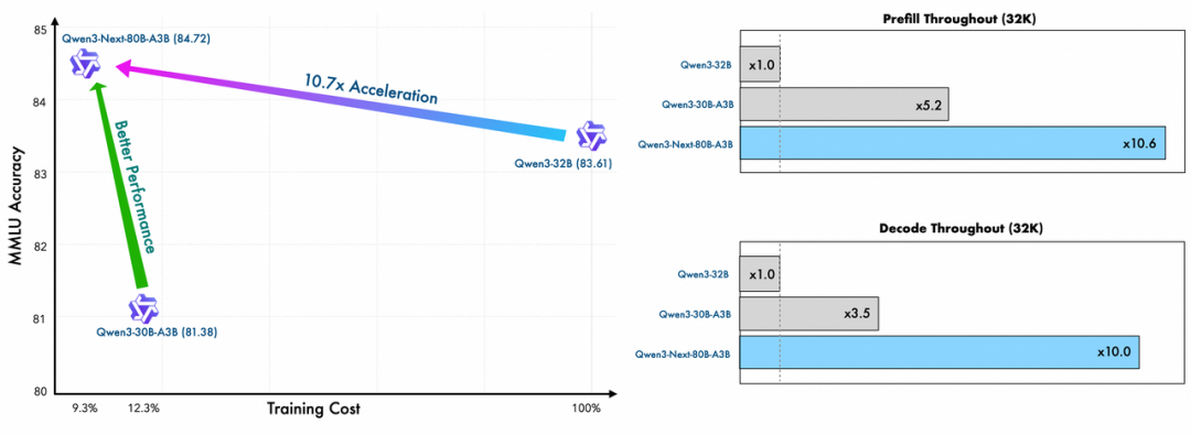 让Qwen3-Next-80B-A3B得训练成本较Qwen3-30B-A3B、Qwen3-32B低很多,同时推理速度更快。
