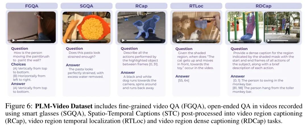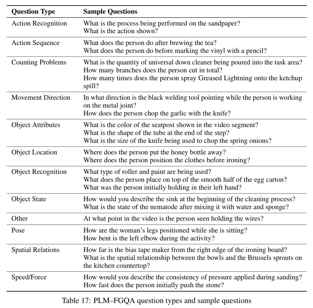 PLM-FGQA:280万个细粒度视频问答对,覆盖动作识别、时间感知、空间理解等任务。 -