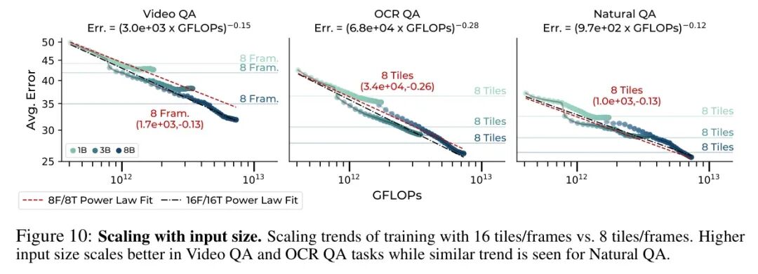 解码器规模的扩展。图2展示了PLM在不同LLM规模下的扩展行为。作者在对数尺度上展示了验证集误差和训练计算量,其中黑色线性线表示两者之间的幂律关系。不同的颜色(绿色、青色和蓝色)代表不同的语言模型规模( ),同时保持视觉编码器规模恒定为 。如上文设置部分所述,作者展示了每个基准类别中帕累托前沿的幂律拟合。作者还展示了仅使用 4 M 人类标注数据集训练的PLM结果作为 Baseline,用每种颜色的水平线表示。从水平线到数据点的差距标志着合成数据的影响。有趣的是,所有三个基准类别的测试都显示出计算量和平均基准误差之间的清晰幂律关系,幂律指数( )分别为Video QA的 -0.15 、OCR QA的 -0.20 和Natural Image QA的-0.11。在附录B中,作者提供了更多细节并将分析扩展到(1)扩展编码器规模,以及(2)扩展图像分辨率和视频帧。