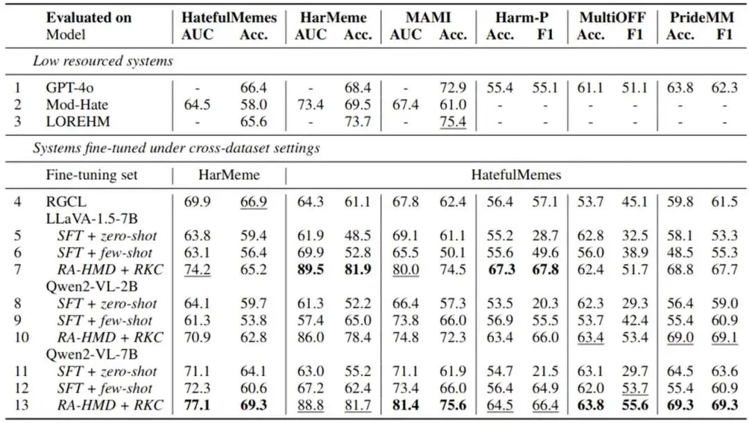 在训练-测试分布不一致设定下,RA-HMD + RKC在HarMeme上达到88.8% AUC,较SFT few-shot提升超20%; -