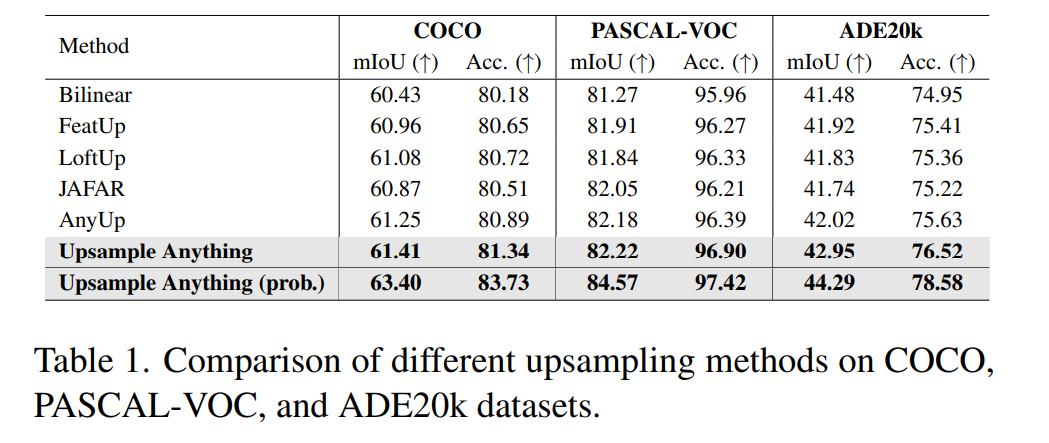 “上采样万物”(概率版)。除了对特征图进行上采样外,我们还评估了一种低计算量变体,该变体在特征分辨率下预测分割(不进行特征上采样),生成概率图,然后使用我们的方法将概率上采样到原始图像大小。由于对数几率/概率位于小得多的空间网格上,这一流程实现了最低的计算成本,同时在表1中达到了最高准确率。