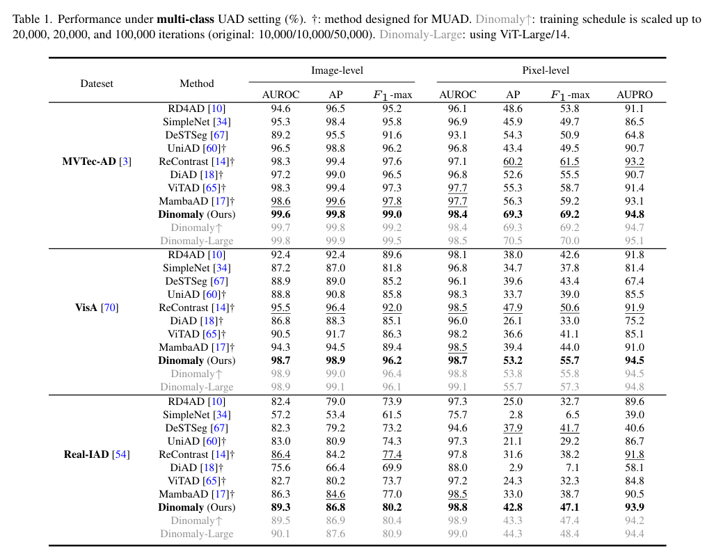 Real-IAD: 多类SOTA (86.4%),单类SOTA(89.4%),Dinomaly-Large (90.1%)