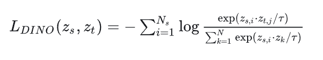 **DINO V2 定义了一个 Contrastive Loss (对比损失)**来衡量 _zt_ 和 _zs_ 之间的距离。 Distillation Loss 其实就是一种 Contrastive Loss。。