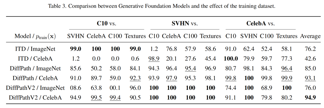 从表1的结果能清晰看到,DiffPathV2在几乎所有数据集组合中都拿到了最高分(粗体所示)。特别是在CIFAR-10与CIFAR-100这种"近OOD"场景(语义非常接近),表现尤为突出: