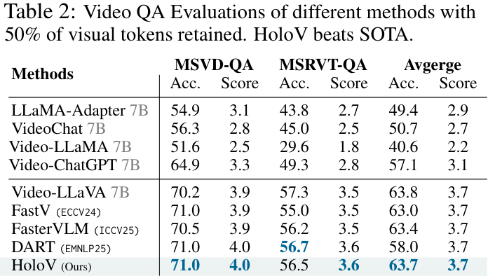 从上面两个性能对比表中可以看到,无论是在哪个基准测试上,HoloV(蓝色字体)的平均性能都远超其他SOTA方法,尤其是在高剪枝率(如87.5%)下,优势更为明显。