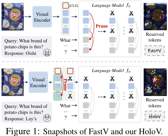 最近,一篇被 NeurIPS 2025 接收的论文《Don't Just Chase "Highlighted Tokens" in MLLMs: Revisiting Visual Holistic Context Retention》对现有的剪枝方法提出了挑战,并带来了一个简单又高效的解决方案—— HoloV。这项研究由香港科技大学、INSAIT、索非亚大学和上海交通大学等机构的研究者们共同完成。HoloV这个名字源于“Holistic Vision”,强调了它在剪枝时所采用的“全局视觉”策略。