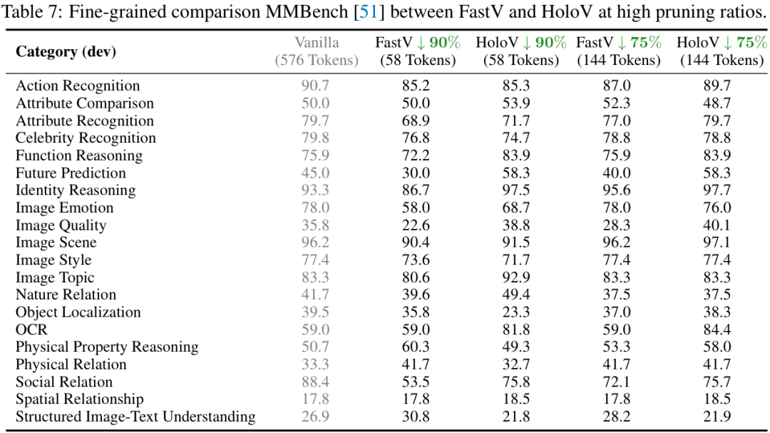 最惊人的结果是,在LLaVA-1.5模型上,HoloV 在剪掉了88.9%的视觉Token后,依然保留了原始模型95.8%的性能,实现了顶尖的效率-精度权衡。