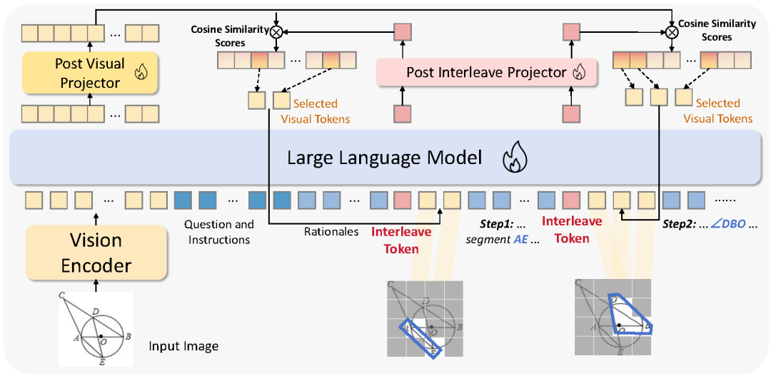 核心创新在于引入了一种特殊的 Interleave Token——模型在生成下一个 token 时,会动态从图像中选取与当前推理步骤最相关的视觉 token,并嵌入文本推理链中。这个过程通过计算计算 Interleave Token 的隐藏层与所有视觉 token 的隐藏层的相似度来实现,从而动态选取与数学概念最相关的视觉区域,将图像与文本细粒度地融合。