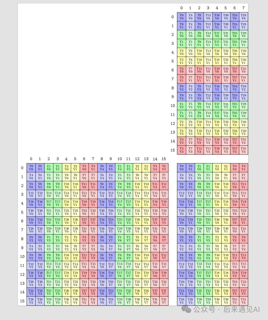 上图中左边是源矩阵,右边是目标矩阵,可以看出其加载过程以及寄存器中持有的元素布局与上面介绍的矩阵 A 完全一致。