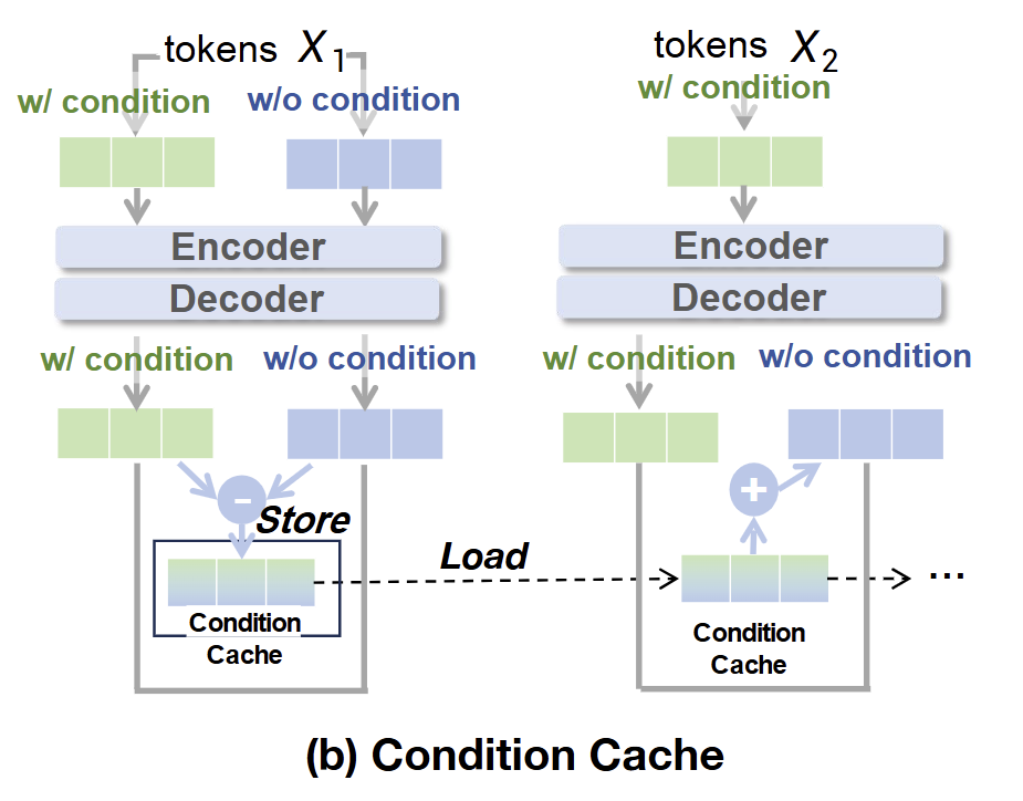 存储之前步骤中 token,且在接下来的步骤中重用这些 token 进行加速。为了减少对生成质量的负面影响,仍然计算前几个 decoding step,因为这对于确定图像的基本内容至关重要。同时,通过存储这些步骤计算的特征来初始化 Token Cache。
